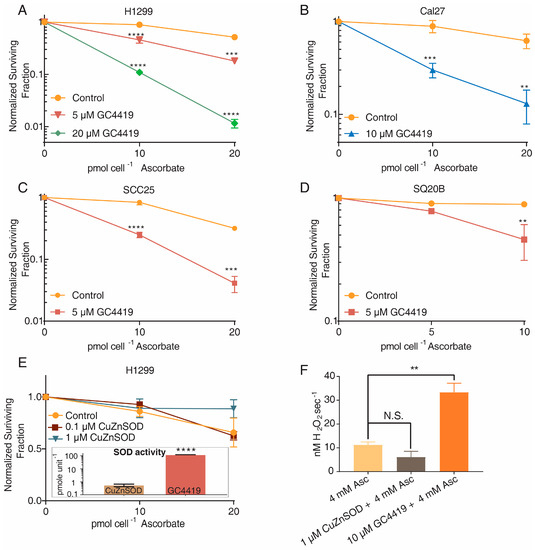 GC4419, but not CuZnSOD, increases cancer cell toxicity and H2O2 production when combined with AscH−. (A–D) When added 24 h prior to and during 1 h AscH− treatment, GC4419 significantly increases the toxicity of AscH− in lung (H1299) and head-and-neck (Cal27, SQ20B, SCC25) cancer cell lines. Errors represent ± SEM, n = 3 with at least two cloning dishes per treatment. ** p < 0.01, *** p < 0.001, **** p < 0.0001 vs. Control by two-way ANOVA. Normalized to Control or GC4419-treated group. (E) Cells were treated with 0.1–10 μM CuZnSOD for 24 h prior to and during AscH− treatment. n = 4 with at least two cloning dishes per treatment. Normalized to Control or CuZnSOD groups. Inset: CuZnSOD exhibits approximately 240 times greater specific SOD activity relative to GC4419 as determined using a NBT-based competitive inhibition assay. Errors represent ± SEM, n = 3. **** p < 0.0001 vs. CuZnSOD by upaired t-test (F) Accumulation of H2O2 was determined using a Clark electrode (YSI Inc., Yellow Springs, OH, USA). AscH−, GC4419 + AscH− or CuZnSOD + AscH− were added to RPMI media containing 10% FBS. The concentration of H2O2 was determined based on the amount of O2 generated following addition of 500 U mL−1 of catalase. Errors represent ± SEM, n = 3–4. ** p < 0.01, vs. Control by unpaired t-test.