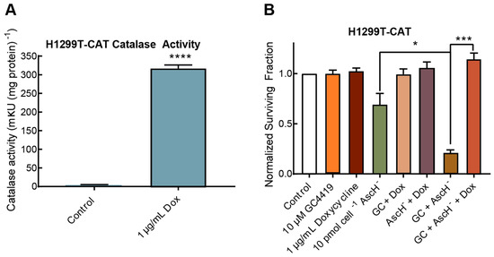 Anticancer effect of GC/AscH− is dependent on H2O2. (A) Catalase overexpression was verified in H1299T-CAT lung cancer cell lines exposed to 1 μg mL−1 doxycycline. Errors represent ± SEM, n = 12. **** p < 0.0001 vs. Control by unpaired t-test. (B) Overexpression of catalase completely rescued H1299T-CAT cells from toxicity induced by GC/AscH−. Errors represent ± SEM, n = 3 with at least two cloning dishes per treatment. * p < 0.05, *** p < 0.001 by unpaired t-test. Normalized to Control.