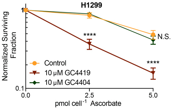 To determine if catalytic cycling of the pentaazamacrocycle is required for the enhancement of AscH− toxicity, we combined AscH− with GC4404, a Mn(II)-pentaazamacrocyclic derivative that is devoid of SOD activity. GC4404 does not form the Mn(III)-intermediate, which has been suggested to be reduced by AscH− [18,21]. Media were replaced, and H1299 lung cancer cells were treated with GC4419 or GC4404 for 1 h prior to and during the 1 h AscH− treatment. As predicted, GC4419 enhanced the toxicity of AscH− while GC4404 had no effect on AscH− toxicity (Figure 4). These results further support the hypothesis that catalytic cycling of the pentaazamacrocycle is required for the enhancement of AscH− toxicity.