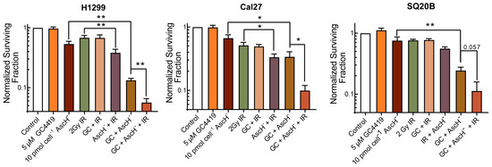 Patients being treated with GC4419 in clinical trials to date (i.e., NCT02508389) all received radiation treatment; H2O2 is known to increase tumor response to radiation [5,31]. Thus, combining AscH− and GC4419 with radiation has the potential to improve tumor therapy outcomes. To investigate the ability of GC/AscH− to enhance the response of cancer cells to ionizing radiation (IR), cancer cells were exposed to GC4419 for 24 h and AscH− for 1 h prior to exposure to IR. Interestingly, the treatment with GC/AscH− prior to 2 Gy IR resulted in cancer cell killing that was at least additive and significantly exceeded that seen with either agent alone in two cell lines, with a third trending toward significance (Figure 5).