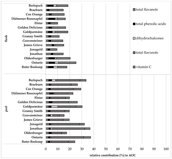 Hyperoside had the highest contribution (6.8%) to the AOC in the peel, followed by quercitrin (2.1%) and avicularin (2.0%), whereas in the flesh, phloridzin and chlorogenic acid (1.2%) contributed the most, followed by caffeic acid (1.0%) and procyanidin A2 (0.8%). Considering the content of each polyphenolic compound, the total polyphenols had an average contribution of 21.2% (11.5–32.5%) to the AOC in the peel and of 6.8% (2.9–10.5%) to AOC in the flesh. In the apple peel, an average of 15.9% of the calculated AOC was due to the flavonols, 2.5% due to the flavanols, 1.7% due to the phenolic acids and 1.1% due to the dihydrochalcone phloridzin (Figure 1). Of the three polyphenolic groups identified in the flesh, the total phenolic acids provided 3.0%, followed by the total flavanols (2.6%) and the dihydrochalcone phloridzin (1.2%) (Figure 1). These results are in agreement with other publications, showing a strong AOA for flavanols and flavonols, being thus main contributors to the AOC of apples [3,7,8,36,37]. In addition to the polyphenols, vitamin C contributed to the AOC of peel (4.9%) and flesh (9.1%). These results clearly indicate that in the peel flavonols rather than vitamin C made the major contribution to AOC of apples, whereas in the flesh, vitamin C provided the highest contribution.