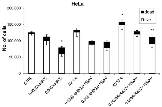 The HeLa cells did not show sensitivity to a lower dose of H2O2, while a higher concentration reduced the cell count and increased the incidence of dead cells, thus indicating a further decay of the H2O2-treated cells. The AV extract did not show any prominent effects if used at 1% concentration; however, at the higher 10% concentration, the growth of the HeLa cells increased slightly and the cytotoxicity was reduced.