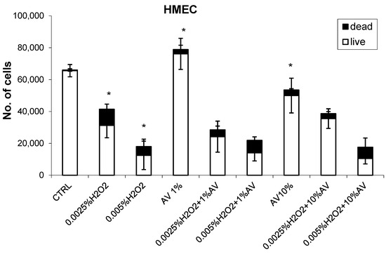 The effects of AV extract (1 or 10%) on the human microvascular endothelial cells (HMEC) with respect to H2O2 treatment (0.0025% or 0.05%). The cell count values (viability determined using Trypan blue) were obtained 24 h after treatment (H2O2 followed by AV extract 1 h later) and are given as mean values for triplicates. * significant difference to untreated control.