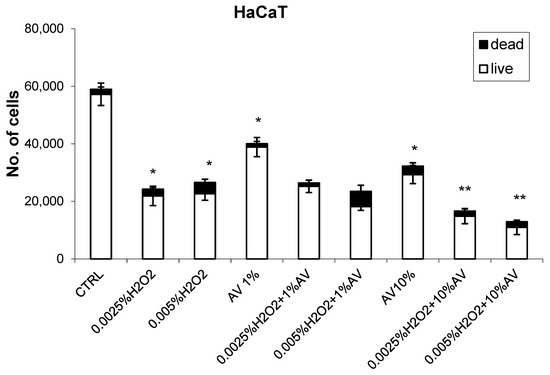 The effects of AV extract (1 or 10%) on the human keratinocyte (HaCaT) cells with respect to H2O2 treatment (0.0025% or 0.05%). The cell count values (viability determined using Trypan blue) were obtained 24 h after treatment (H2O2 followed by AV extract 1 h later) and are given as mean values for triplicates. * significant difference to untreated control; ** significant difference to respective H2O2 treatment alone.
