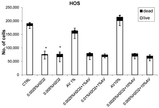 The effects of AV extract (1 or 10%) on the human osteosarcoma (HOS) cells with respect to H2O2 treatment (0.0025% or 0.05%). The cell count values (viability determined using Trypan blue) were obtained 24 h after treatment (H2O2 followed by AV extract 1 h later) and are given as mean values for triplicates. * significant difference to untreated control.