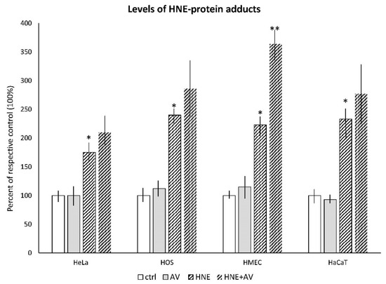 The amounts of HNE–protein adducts developed in the cells after treatment with HNE and AV 1% extract, or without the plant extract are presented in Figure 6.
