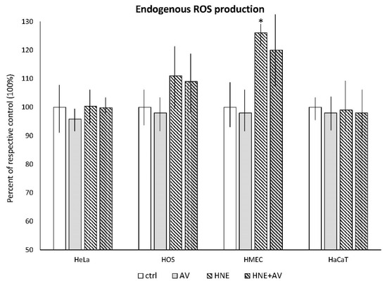 The HMEC cells were the only cell line that responded to HNE treatment in terms of change in endogenous production of ROS. However, while treatment with HNE slightly increased (by 29%) intracellular production of ROS in the HMEC cells, the AV extract had no influence, as it did not induce ROS production in any cell line tested.