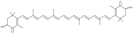 ASX is a polar carotenoid that contains two oxygenated ends on each tail of the structure (Figure 1) [4]. The oxygenated ends are hydroxyl groups, which give the molecule minimal soluble properties. ASX is a long chain of carbon rings that have double bonds in every ring and double-bonded oxygen molecules on the end ring structures. The chemical formula for ASX is C40H52O4.