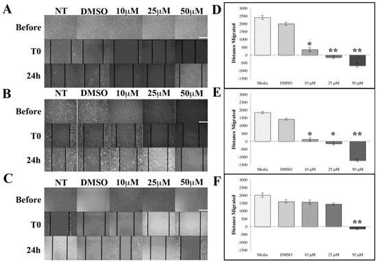 Most cancer deaths are caused by metastases where tumor cells migrate. These three different cell lines encompass two breast cancer lines and one normal line to act as the experimental control. Figure 2 shows the migration assay results for each individual cell line. As shown in Figure 2A,B, the cells grow normally when cultured in media and DMSO settings. When the cells are exposed to ASX at increasing concentrations, the distance that the cells migrated declined until the cells started to recede at the 25 and 50 μM concentrations. MCF-7 ER+ breast cancer cells show an immediate decline in cell migration when ASX is administered. As the concentration increases from 10 μM to 25 μM and 50 μM, the results become significant to p < 0.01. Similar results were seen with the MDA-MB-231 TNBC cell line (Figure 2B). The two breast cancer cell lines both showed an immediate decrease in distance migrated as soon as ASX is administered. This decrease in distance traveled continued until the highest concentration (50 μM). The MCF-10A cell line is a control normal breast epithelial cell line. The distance migrated by the MCF10A cells did not decrease immediately with the addition of ASX, nor did it decrease when the concentration was increased to 25 μM (Figure 2C). The noticeable decrease in distance migrated only happened at the highest concentration of ASX suggesting 50 μM ASX is toxic to all cells used in these studies.
