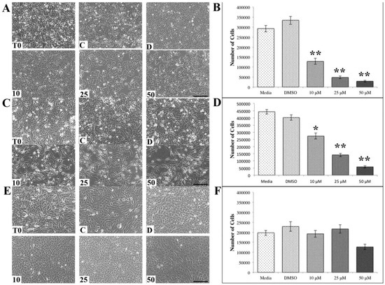 Astaxanthin (ASX) affects cell numbers. (A) MCF7 cells treated with ASX at concentrations indicated for 24 h; (B) quantification of (A); (C) MDA-MB-231 cells treated with ASX; (D) quantification of (C); and (E) MCF10A cells treated with ASX at concentrations indicated for 24 h and quantified in (F). (T0-time zero, C-untreated, D-DMSO, 10 μM, 25 μM, 50 μM). Scale bars = 100 μm. * p < 0.05, ** p < 0.01.