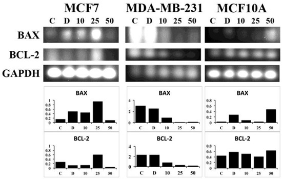 Gene expression of apoptotic mediators following ASX treatment. MCF7, MDA-MB-231, and MCF10A cells were treated with ASX for 24 h at the concentrations indicated. RT-PCR results are presented and the corresponding expression levels of the indicated gene normalized to GAPDH in arbitrary units. C-untreated, D-DMSO, 10 μM, 25 μM, and 50 μM.