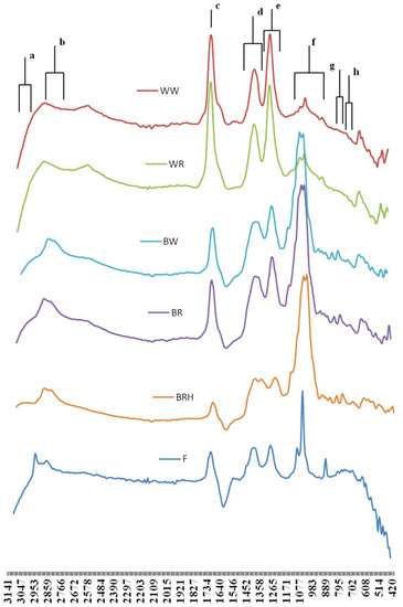 FT-IR absorbance spectra of vinegars. Main absorbance peaks are described using annotations above the upper spectrum: a. 3100–3050 cm−1: C–H stretching vibrations of aryl or vinyl groups; b. 2940–2840 cm−1: C–H stretching of methyl- and methylene groups of carbohydrates or carboxylic acids; c. 1721 cm−1: C=O stretching of carboxylic acids; d. 1425–1380 cm−1: C–C stretching vibration of phenyl groups of aromatic compounds; e. 1300–1260 cm−1: C–O stretching vibrations of hydroxyflavonoids; f. 1170–950 cm−1: C–O and C–C stretching of carbohydrates, polysaccharides, or flavonoids; (broad bands) stretching and bending vibrations of CH2OH group of carbohydrates; g. 825–810 cm−1: C–H out of plane bending vibrations of phenyl ring of polyphenols; h. 790 to 760 cm−1: aromatic ring vibrations.