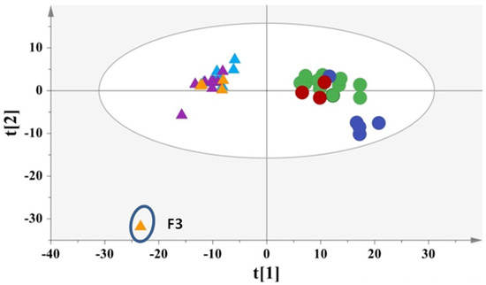 PCA, N = 43, R2X(cum)= 0.94, Q2(cum)= 0.87 (Circles = balsamic vinegars, Triangles = common vinegars, green = red balsamic vinegars with honey, blue = red balsamic vinegars, red = white balsamic vinegars, turquoise = red common vinegars, purple = white common vinegars, orange = common vinegars from fruits, F3 = common vinegar with Sea Buckthorn).