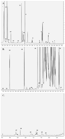 A series of 2D experiments, gCOSY, zTOCSY, gHMBCad, gHSQCad were recorded at 25 °C and permitted the assignment of the existing metabolites. The interpretation of 2D spectra was performed with the use of MestReNova v.10.1 software. The identification procedure was based on 2D NMR spectra, the Chenomx Suite 7.0 reference 1H NMR metabolic database and literature data [12,13].