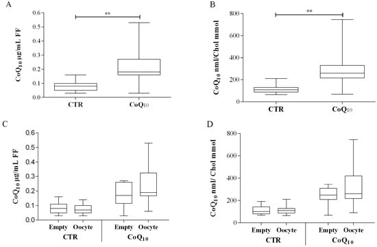 Follicular fluid (FF) coenzyme Q10 content in control (CTRn = 51) and supplemented IVF patients (CoQ10n = 69). CoQ10 is expressed both per volume of follicular fluid as µg CoQ10/mL FF (A) or normalized for cholesterol content as nmol CoQ10/mmol Chol (B). Sub analysis in relation to oocyte content as µg CoQ10/mL FF (C) or normalized for cholesterol content nmol CoQ10/mmol Chol (D). ** p < 0.01. (oocyte containing follicles n = 30 CTR; n = 44CoQ).