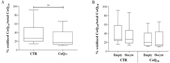 This increase was significant also after cholesterol normalization producing a variation from 113 ± 37 to 312 ± 188 nmol CoQ10/mmol Cholesterol (+166%; p < 0.01) (Figure 1B). Considering the number of oocyte in each analyzed follicle, in subjects not supplemented with CoQ10 no significant differences were observed between follicles containing at least one oocyte (and follicles from which no oocytes were recovered (Figure 1C,D). On the contrary, in supplemented subjects, follicle containing oocytes presented higher levels of CoQ10 compared to follicles from which an oocytes was not recovered expressed both as µg/mL FF (values 0.25 ± 0.14 vs. 0.18 ± 0.08 µg/mL respectively) and after cholesterol normalization as CoQ10 nmol/Chol mmol, (values 351 ± 222 vs. 246 ± 78 nmol/mmol respectively) almost reaching significance levels (p = 0.058) (Figure 1C,D). In relation to oxidative parameters, the percentage of oxidized CoQ10 was significantly lower in patients supplemented with CoQ10 (27 ± 18%) compared to control (38 ± 24%), p < 0.01 (Figure 2A).