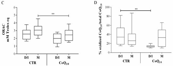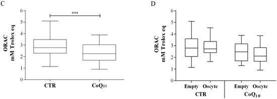 Follicular fluid (FF) coenzyme Q10 oxidative status and Oxygen Radical Absorbing Capacity (ORAC) in control (CTRn = 51) and supplemented IVF patients (CoQ10n = 69). CoQ10 oxidation is expressed as % of oxidized CoQ10/total CoQ10 (A,B), while ORAC value is expressed as mMTrolox equivalents (C,D). Sub analysis in relation to oocyte content as % of oxidized CoQ10/total CoQ10 (B) or mMTrolox equivalents (D). ** p < 0.01; *** p < 0.001. (oocyte containing follicles n = 30 CTR; n = 44CoQ).