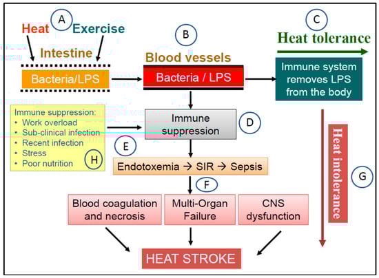 The heat sepsis pathway in the dual pathway model (DPM) of heat stroke (HS). (A) Exercise and heat stresses cause the permeability of the gut epithelium to increase, which leads to the leakage of gram-negative bacteria and lipopolysaccharides (LPS) from the gut into the circulatory system (B). In a healthy state, when immune functions are not compromised, LPS in the circulation is removed from the body by monocytes, high density lipoproteins, and LPS-specific antibodies. Under these circumstance, the physical task is completed without heat-related health consequences i.e., heat tolerance (C). However, when undertaking the same physical task in a state of immune suppression (D) can compromise LPS clearance, which leads to the accumulation of LPS in the blood i.e., endotoxemia (E). The concentration of LPS in the blood reaches a threshold that triggers the systemic inflammatory response (SIR), which can lead eventually to sepsis. The resulting clinical presentation include massive blood coagulation, necrosis, cellular damage, multi-organ failure, and central nervous system disturbances (F), which are seen in HS victims i.e., a state of heat intolerance (G). In this pathway, the state of the immune system can function as a switch between heat tolerance and intolerance i.e., transient heat tolerance. Examples of circumstances that can cause immune suppression are also suggested in the diagram (H).
