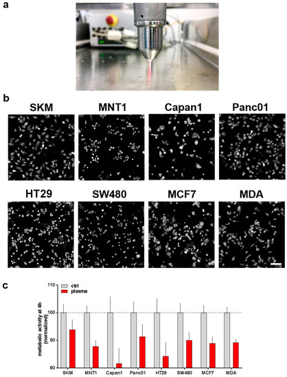 Exposure of initially-seeded 1 × 104 cells of eight human tumor cell lines to plasma-treated medium led to a reduction in metabolic activity. (a) Representative image of the atmospheric pressure argon plasma jet (kINPen) utilized; (b) representative images in digital phase contrast (DPC) mode showing cytosolic fraction of all cell types investigated; (c) metabolic activity (as measured using resazurin) 4 h following exposure to control or PTM, data are normalized to that of control medium. Data are from 8 independent experiments with four technical replicates each. Scale bar = 100 µm. Red bars = plasma-treated medium (PTM); grey bars = untreated medium (control).