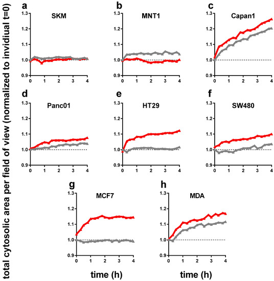 Next, we performed live cell time lapse imaging of all eight cell lines for up to 4 h following incubation either with control or PTM. For each well, the total cellular cytosolic area (as measure of accumulated cellular spread of all cells identified per field of view) was quantified to normalize to t = 0 for each sample to monitor changes of time. Except melanoma cells (Figure 2a,b), all cell types showed a significant increase in total cytosolic area (Figure 2c–h). As some these changes were sudden within the first hour after treatment, we attribute this behavior to cellular swelling that is often associated with cellular repair and cycle arrest, which may be linked to the findings of reduced metabolic activity (Figure 1c). This effect was particular pronounced in HT29, SW480, and MCF7, and rather moderate in pancreatic tumor cell lines Capan1 and Panc01. Changes in the osmolality of PTM can be excluded as not all cell types exposed to PTM changed (e.g., SKM and MNT1) and some cell types increased their sum cytosolic area also in control medium (e.g., Capan1 and MDA).
