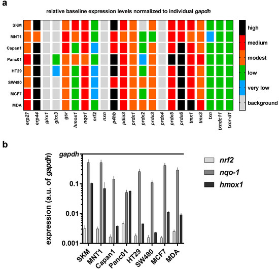 Heat map of transcriptional levels of 22 redox-related proteins in relation to cell line-specific levels of the house keeping gene gapdh as assessed via qPCR. (a) relative baseline values for all transcripts investigated in eight different human cell lines; (b) data from heat map represented for three targets known to respond to oxidative stress (nrf2, nqo1, and hmox1) for better individual comparison. Data are from three to four independent experiments.