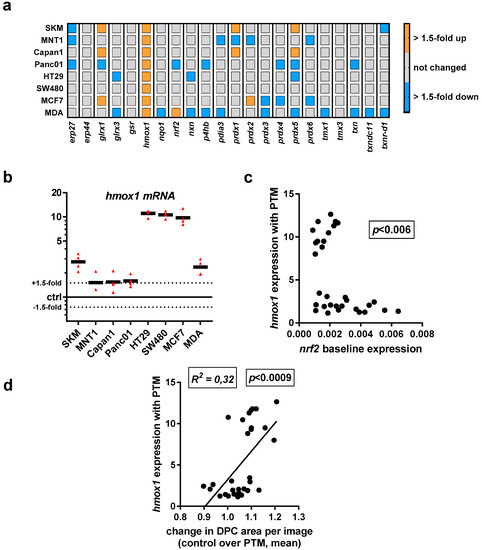 Having investigated the baseline transcriptional expression levels of 22 redox-related proteins in eight human cancer cell lines, we investigated their up or downregulation following exposure to PTM at 4 h. We did not identify a consistent change with all except one target (hmox1) quantified across all cell lines used in this study (Figure 4a). A mixed response was observed for glrx1, prdx1, and prdx5. A more detailed analysis display of hmox1 data revealed a pronounced upregulation, particularly with HT29, SW480, and MCF7 cells (Figure 4b). As hmox1 is known to be a target of nrf2, correlation analysis was performed between baseline nfr2 expression levels and hmox1 expression levels induced with PTM. A significant inverse correlation was observed between both factors (Figure 4c). Especially for the three cell lines with high upregulation of hmox1 following PTM exposure, a rather low nrf2 baseline expression was observed. Interestingly, through quantification of the DPC signal after challenging the cells with ROS/RNS, we found a correlation between the expression of hmox1 and the change in cytosolic area (Figure 4d). Hence, a high hmox1 expression is characteristic, together with an increased cell area after PTM treatment.