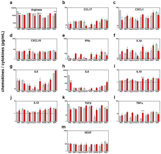 Exposure to PTM alters the chemokine/cytokine profile in supernatants of eight human cancer cell lines. Quantification of (a) arginase, (b) CCL17, (c) CXCL1, (d) CXCL10, (e) IFNγ, (f) IL1β, (g) IL6, (h) IL8, (i) IL10, (j) IL12, (k) TGFβ, (l) TNFα, and (m) VEGF; all concentrations are pg/mL; lines indicate the target-specific limit of detection (LOD). Data are pooled from eight independent experiments. Red bars = plasma-treated medium (PTM); grey bars = untreated medium (control).