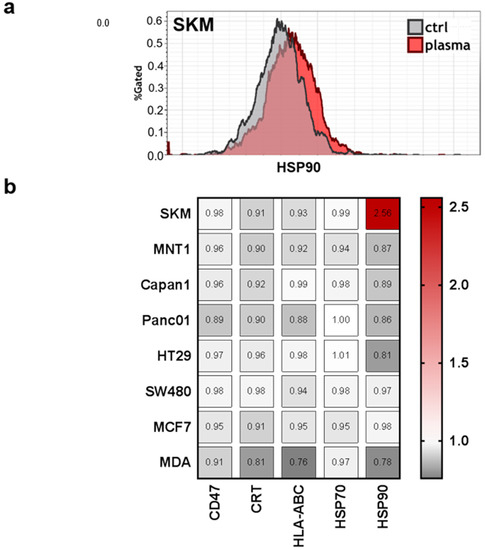 Moreover, previous studies indicated that tumor-toxic concentrations of plasma-derived ROS/RNS are capable of inducing the immunogenic cancer cell death (ICD) [40]. This type of cell death promotes antitumor immune responses, and is characterized by release upregulation of a number of molecules on the cell membrane, such as calreticulin (CRT), major histocompatibility complex I (MHC class I; HLA-ABC), and heat-shock proteins (HSP) 70 and 90 [41]. This may be accompanied by a downregulation of CD47, which promotes the phagocytosis of tumor cells [34]. However, only SK-Mel 28 (SKM) cells showed a considerable increase of HSP90 on the membrane of living cells (Figure 6a). For all other surface molecules and cell lines, there were only minor changes that were observed in response to PTM at 4 h when normalized each respective control (Figure 6b). This may be due to the overall mild effect (short plasma treatment time) of the PTM.