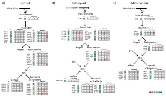 The enzymes of the redox-regulatory network are localized in different subcellular compartments of the cell (Figure 2A,C). Frequently more than one isoform of the redox elements is present in the different compartments. The three schemes assemble published transcript changes for the three subcellular compartments cytosol, chloroplast, and mitochondrion during a time course of 24 h cold treatment [8].