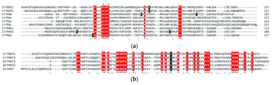 Multiple sequence alignment of plant thioredoxins (TRXs). (a) Sequence alignment of TRXs from Chlamydomonas reinhardtii (CrTRXs). CrTRXs were aligned using Clustal Omega [44,45]. The sequences used correspond to mature forms either known or predicted by the ChloroP prediction software [40]. Abbreviations and accession numbers: CrTRXf1, Chlamydomonas reinhardtii TRX f1 (UniProt ID: Q84XR8); CrTRXf2, Chlamydomonas reinhardtii TRX f2 (UniProt ID: A0A2K3DSC9); CrTRXm, Chlamydomonas reinhardtii TRX m (UniProt ID: P23400); CrTRXx, Chlamydomonas reinhardtii TRX x (UniProt ID: Q84XR9); CrTRXy, Chlamydomonas reinhardtii TRX y (UniProt ID: Q84XS2); CrTRXz, Chlamydomonas reinhardtii TRX z (UniProt ID: A8J0Q8); CrTRXh1, Chlamydomonas reinhardtii TRX h1 (UniProt ID: P80028); CrTRXh2, Chlamydomonas reinhardtii TRX h2 (UniProt ID: Q84XS1); CrTRXo, Chlamydomonas reinhardtii TRX o (UniProt ID: Q84XS0). An asterisk (*) indicates positions that have a single, fully conserved residue. These residues are highlighted in white on a red background. Catalytic Cys are marked with two arrows. A colon (:) indicates conservation between groups of strongly similar properties, scoring > 0.5 in the Gonnet point accepted mutation (PAM) 250 matrix. A period (.) indicates conservation between groups of weakly similar properties, scoring ≤ 0.5 in the Gonnet PAM 250 matrix. Cys residues other than the catalytic ones are highlighted in white on a black background. (b) Sequence alignment of Chlamydomonas reinhardtii, Arabidopsis thaliana, and Spinacia oleracea f-type TRXs. Mature proteins were aligned as described in panel (a). Abbreviations and accession numbers: CrTRXf1, Chlamydomonas reinhardtii TRX f1 (UniProt ID: Q84XR8); CrTRXf2, Chlamydomonas reinhardtii TRX f2 (UniProt ID: A0A2K3DSC9); AtTRXf1, Arabidopsis thaliana TRX f1 (UniProt ID: Q9XFH8); AtTRXf2, Arabidopsis thaliana TRX f2 (UniProt ID: Q9XFH9); SoTRXf, Spinacia oleracea TRX f (UniProt ID: P09856). An asterisk (*) indicates positions that have a single, fully conserved residue. These residues are highlighted in white on a red background, except the conserved non-catalytic Cys that is highlighted in white on a black background. A colon (:) indicates conservation between groups of strongly similar properties, scoring > 0.5 in the Gonnet PAM 250 matrix. A period (.) indicates conservation between groups of weakly similar properties, scoring ≤ 0.5 in the Gonnet PAM 250 matrix.