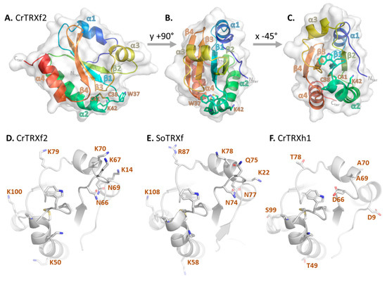 CrTRXf2 Cys38-Cys41 site is surrounded by basic side chains of six lysines (Lys14, Lys50, Lys67, Lys70, Lys79, Lys100) and two hydrogen bond donor side chains (Asn66, Asn69) (Figure 2D). These positions align with positively charged (Lys22, Lys58, Lys78, Arg87, Lys108) or hydrogen bond donor side chains (Asn74, Asn77) of the spinach TRX f ortholog (PDB ID: 1FAA, 1F9M) [60] (Figure 2E). CrTRXf2 electropositive patches locate on the α-helix 3 side of the disulfide, and on the β-strand 2 side of the disulfide. These eight positions form an electropositive crown around the active site, conserved in both plant and algal enzymes (Figure 2D,E). In striking opposition, the corresponding residues in CrTRXh1 are negatively charged (Asp9, Asp66), electronegative (Thr49, Thr78, Ser99), or neutral (Ala69, Ala70) (Figure 2F). CrTRXh1 corresponding surface displays an electronegative potential on the α-helix 3 side of the disulfide and of negligible polarity on the β-strand 2 side of the disulfide. Hence, despite the strong conservation bias for a common fold and active site composition, CrTRXf2 and CrTRXh1 display distinct electrostatic potential on their solvent accessible surface (Figure 4B,C).