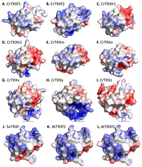 The electropositive surface of CrTRXf2 compares with the equivalent regions of modelled CrTRXf1, although the latter possess a more neutral character (Figure 4A,B). If experimentally confirmed, this may explain a more stringent specificity of CrTRXf2 than CrTRXf1 for equivalent targets. This f-type electropositive character is maintained in land plant enzymes (Figure 4J–L). CrTRXh1 and the modelled CrTRXh2 both present mixed polarities, confirming the significant difference of these cytoplasmic isoforms compared to the f-type CrTRXs (Figure 4C,D). The surface of chloroplast CrTRXm is closer to the h- than f-type CrTRXs (Figure 4E), while modelled CrTRXx, CrTRXy, and CrTRXz all present neutral or electronegative surfaces around the catalytic cysteines (Figure 4G–I). The modelled mitochondrial CrTRXo appears similar to CrTRXh1 and m (Figure 4F).