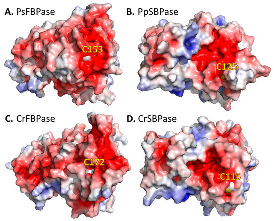 Protein–protein interaction with specific CrTRXf2 targets would involve a complementary electronegative surface. Indeed, we observed an extended continuous electronegative surface around the cysteines of the two f-type TRXs targets, FBPase and SBPase (Figure 5). Moreover, the electronegative character of targets was identically observed in orthologues from both vascular (Pisum sativum [70], Figure 5A) and non-vascular land plants (Physcomitrella patens [32]), accounting for the conservation of this structural feature over speciation and evolution. We applied molecular docking simulations to orient possible interactions of CrTRXf2 with pea FBPase [70]. The FRODOCK algorithm [71] suggested 10 docking models of CrTRXf2 on the pea FBPase surface, four placed CysN of CrTRXf2 in the vicinity of target Cys153. These plausible solutions all bring the electropositive surface of α-helix 3 in contact with the target electronegative surface. Contrarily, the alignment of CrTRXh1 at the docked positions unfavorably joins the negative patches of both surfaces.