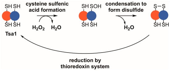 Tsa1 and other typical 2-Cys peroxiredoxins detoxify peroxides through a thiol-dependent, disulfide-based mechanism. Upon binding a peroxide, Tsa1 is oxidized on its peroxidatic cysteine to form a cysteine sulfenic acid (–SOH). Subsequently, the sulfenic acid condenses with the thiol in the resolving cysteine to form a disulfide bond. Thioredoxins reduce the resulting disulfide bond to complete the catalytic cycle.