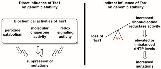 Tsa1 may influence mutation rates in a direct and/or an indirect way. Given the three biochemical activities of Tsa1 and related peroxiredoxins (i.e., peroxide detoxification, molecular chaperone activity, and redox switch activity), it is possible that any of these directly contribute to suppressing mutations. However, there is evidence suggesting that Tsa1 may influence genomic stability by titrating thioredoxin away from other substrates involved in DNA synthesis or repair, most notably ribonucleotide reductase. In the case of the Tsa1-ribonucleotide reductase competition hypothesis, Tsa1-mediated thioredoxin (Trx) sequestration may be a way of regulating ribonucleotide reductase activity, thereby maintaining appropriate dNTP levels and lowering mutation rates.