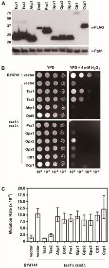 5.1. Monitoring Whether Tsa1 Influences Mutation Rates Based on Its Peroxidase Activity
