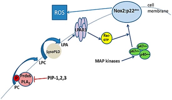 - Vazquez-Medina, J.P.; Dodia, C.; Weng, L.; Mesaros, C.; Blair, I.; Feinstein, S.I.; Chatterjee, C.; Fisher, A. The phospholipase A2 activity of peroxiredoxin 6 modulates NADPH oxidase 2 activation via lysophosphatidic acid receptor signaling in the pulmonary endothelium and alveolar macrophages. FASEB J. 2016, 30, 2885–2898. [Google Scholar] [CrossRef]