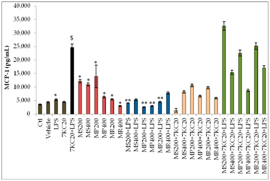 Effect of mint extracts on cytokine secretion. Data shown are mean ± SD from three independent experiments. They were analyzed by the ANOVA’s test followed by a t test. A p-value of 0.05 or less was considered as statistically significant (p < 0.05). No significant differences were observed between control (Ctl; untreated cells) and vehicle (ethanol 0.1%). *: comparison lipopolysaccharide (LPS), Mentha spicata (MS), Mentha pulegium (MP) and Mentha rotundifolia (MR) LPS, MS, MP and MR extracts versus Ctl; #: comparison 7KC20 versus vehicle; $: comparison (7KC20 + LPS) versus vehicle; **: comparison (MS, MP or MR extracts + LPS) versus LPS; ##: comparison (MS, MP or MR extracts + 7KC20) versus 7KC20; $$: comparison (MS, MP or MR extracts + 7KC20 + LPS) versus (7KC20 + LPS). Cytokine values lower than the limit of detection (IL-6: 5 pg/mL; IL-10: 17.5 pg/mL; MCP-1: 52.7 pg/mL; IFN-γ: 2.5 pg/mL; TNFα: 7.3 pg/mL) were considered as not detectable, and are not shown (for details see supplementary Table S1). MCP-1 and TNF-α were detected at high levels in all conditions of treatments. However, IL-6, IL-10 and TNF-α secretions were detected at lower levels, and were often not detectable in several conditions; in those conditions, the missing values in the abscissa correspond to non-detectable values (for details, see supplementary Table S1).