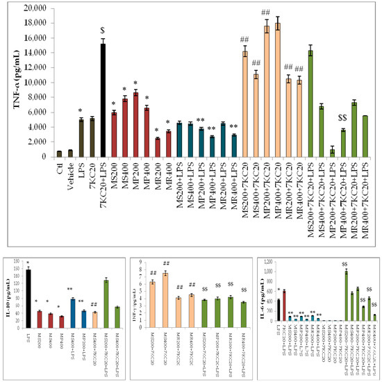 7KC and LPS are potent inducers of inflammation [31,39]. In the present study, we determined the effects of mint extracts on cytokines secretion on murine macrophages RAW 264.7 when they were untreated or treated for 24 h with 7KC (20 µg/mL), LPS (0.2 µg/mL) and LPS associated or not with 7KC.