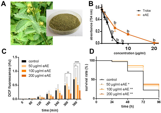 Radical-scavenging and antioxidative effects of eAE. (A) Image of Agrimonia procera plant/dried plant material; (B) Radical scavenging activity (TEAC assay): In this cell-free assay, eAE shows antioxidant properties. Values are mean ± SD, n = 3, one-way ANOVA with Dunnett’s multiple comparisons test vs. control (0 µg/mL), a: ** p ≤ 0.01, b: **** p ≤ 0.0001; (C) Thermally induced increase in ROS (DCF assay): Wild type L4 larvae were treated with different concentrations of eAE or with DMSO (vehicle, 0.4%) for 24 h (20 °C), and were then transferred individually into the wells of a 384-well plate containing 50 µM H2DCF-DA. The increase in fluorescence was measured at 37 °C. Values are mean ± SD, n = 3 (each 16 individuals per group), two-way ANOVA with Dunnett’s multiple comparisons test vs. control at the correspondent time point, * p ≤ 0.05, ** p ≤ 0.01, **** p ≤ 0.0001; (D) Oxidative stress resistance: Wild type L4 larvae were incubated with eAE or with DMSO (vehicle, 0.4%) for 72 h at 20 °C, and all nematodes were then transferred into extract-free media containing 50 mM paraquat. The survival of the nematodes was surveyed via touch-provoked movement every 24 h. Kaplan-Meier statistics were used for the comparison of the survival curves, n = 3 (each 40 individuals per group), Log Rank (Mantel-Cox) test, * p ≤ 0.05, ** p ≤ 0.01. Calculated data for oxidative stress resistance is shown in Supplementary Table S3.