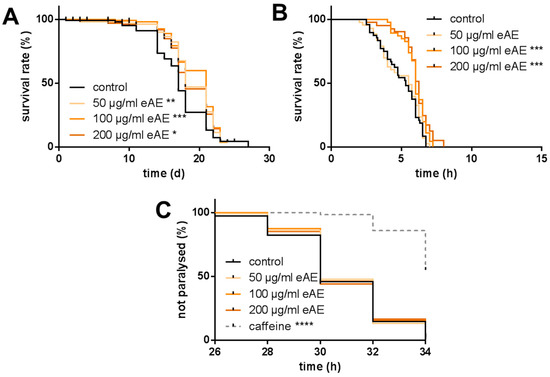 Oxidative stress resistance (Paraquat assay): Synchronized L4 larvae and young adults were treated for three days, with different concentrations of eAE or with DMSO as a control and with FUDR (5-fluorodeoxyuridine) to prevent progeny from hatching. Then, the nematodes were transferred into eAE-free medium containing 50 mM paraquat. For the following four days, the survival of the nematodes was analyzed by touch-provoked movement every 24 h. This experiment was carried out with wild-type nematodes and with the loss-of-function mutant strain CF1038.