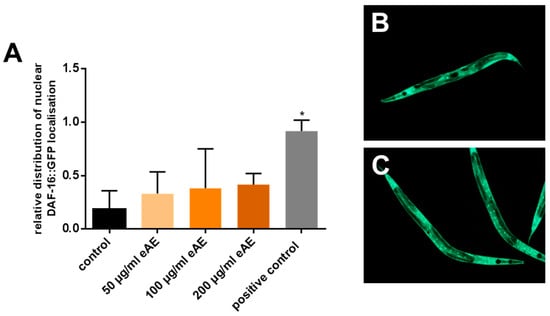 Effects of eAE on the intracellular localization of DAF-16. (A) Intracellular localization of DAF-16: L4 larvae of the transgenic strain TJ356 (DAF-16::GFP) were incubated with different concentrations of eAE or DMSO (vehicle, 0.4%) for 1 h at 20 °C or kept for five minutes at 37 °C (positive control), and localization of the transcription factor was then examined using fluorescence microscopy. Values are mean ± SD, n = 3 (each 20 individuals per group, one-way ANOVA with Tuckey’s multiple comparisons test vs. control, * p ≤ 0.05; (B) representative image for a nematode with mainly cytosolic localization of DAF-16; (C) representative image for nematodes with mainly nuclear localization of DAF-16.