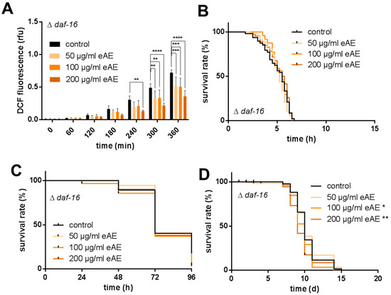 Requirement of DAF-16 for the protective effects of eAE. (A) Thermally induced increase in ROS (DCF assay): L4 larvae deficient in DAF-16 were treated with different concentrations of eAE or with DMSO (vehicle, 0.4%) for 24 h at 20 °C. After washing, they were transferred individually into the wells of a 384-well plate containing 50 µM H2DCF-DA. The increase in fluorescence was measured at 37 °C. Values are mean ± SD, n = 3 (each 16 individuals per group), two-way ANOVA with Dunnett’s multiple comparisons test vs. control at the correspondent time point, ** p ≤ 0.01, *** p ≤ 0.001, **** p ≤ 0.0001; (B) Thermal stress resistance: L4 larvae deficient in DAF-16 were treated with different concentrations of eAE or with DMSO (vehicle, 0.4%) for 24 h at 20 °C. After washing, they were transferred individually into the wells of a 384-well plate containing 1 µM SYTOX® Green. The increase in fluorescence was measured at 37 °C. The graph shows the percentage of viable nematodes. Kaplan-Meier statistics were used for the comparison of the survival curves, n = 3 (each 16 individuals per group), Log Rank (Mantel-Cox) test; (C) Oxidative stress resistance: L4 larvae deficient in DAF-16 were incubated with eAE or with DMSO (vehicle, 0.4%) for 72 h at 20 °C. Then, all nematodes were transferred into extract-fee media containing 50 mM paraquat. Every 24 h, the survival of the nematodes was surveyed via touch-provoked movement. Kaplan-Meier statistics were used for the comparison of the survival curves, n = 3 (each 40 individuals per group), Log Rank (Mantel-Cox) test; (D) Modulation of life span: L4 larvae deficient in DAF-16 were incubated with different concentrations of eAE or DMSO (vehicle, 0.4%). On five days a week, media were exchanged and survival of the nematodes was tested via touch-provoked movement. Kaplan-Meier statistics were used for the comparison of the survival curves, n = 3 (each 40 individuals per group), Log Rank (Mantel-Cox) test, * p ≤ 0.05, ** p ≤ 0.01. Calculated data for thermal and oxidative stress resistance, as well as lifespan, are shown in Supplementary Tables S1–S3.