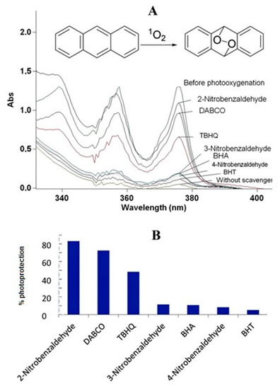 Electronic spectroscopy offers convenient methods for the direct or indirect detection of excited oxygen molecules. For spectrophotometric detection, a suitable chemical probe is usually applied to selectively trap singlet oxygen and enable its quantification based on absorption measurements. A very characteristic reaction suitable for following the photosensitized generation of singlet oxygen is the [4 + 2] cycloaddition with conjugated cyclic dienes or polycyclic aromatic hydrocarbons forming endoperoxide species with modified spectroscopic properties [15,16]. Anthracene is well known to reversibly trap singlet oxygen by such a cycloaddition reaction accompanied by characteristic spectral variations. In the present study, the generation of singlet oxygen induced by photoexcited methylene blue (MB) was evidenced by chemical trapping of 1O2 with anthracene. The UV-Vis spectral variations of anthracene as a function of irradiation time by use of MB as the photosensitizer are displayed in Figure 1A. A decrease of the absorption bands of anthracene (monitored at λmax = 375 nm) was observed with increasing irradiation time. This spectral response can be interpreted as a consequence of the anthracene-9,10-endoperoxide formation interrupting the conjugated π-electron system of the polycyclic aromatic molecule (see Figure 1). It could be shown that the addition of DABCO, BHT, BHA, TBHQ, or 2-nitrobenzaldehyde as a novel antioxidant was able to inhibit the oxidation of anthracene in the order of 2-nitrobenzaldehyde > DABCO > TBHQ > 3-nitrobenzaldehyde > BHA > 4-nitrobenzaldehyde > BHT, as depicted in Figure 1A,B. Moreover, the bleaching reaction did not occur under dark control conditions, which is in agreement with the assumption that the anthracene oxidation requires the formation of singlet oxygen under visible light irradiation of MB. In summary, these results indicate that 2-nitrobenzaldehyde can act as a very effective suppressor of singlet oxygen generation or at least that it prevents substrates such as anthracene from being rapidly oxidized by the characteristic singlet oxygen mediated reactions.