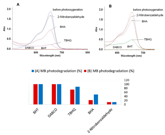 UV-Vis spectra and bar graph showing the degree of photodegradation of MB (λmax = 655 nm) in the presence of different kinds of antioxidants after 24 h of irradiation with 16 fluorescent lamps (λ = 300 nm). Antioxidant concentrations: (A) 1 mmol DABCO, BHA, BHT, TBHQ, and 2-nitrobenzaldehyde. (B) 0.5 mmol DABCO, BHA, BHT, TBHQ, and 2-nitrobenzaldehyde.