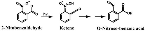 - Laimgruber, S.; Schmierer, T.; Gilch, P.; Kiewischb, K.; Neugebauer, J. The ketene intermediate in the photochemistry of ortho-nitrobenzaldehyde. Phys. Chem. Chem. Phys. 2008, 10, 3872–3882. [Google Scholar] [CrossRef] [PubMed]