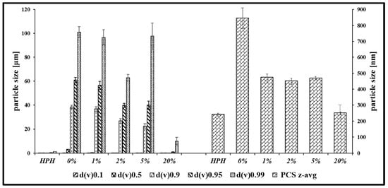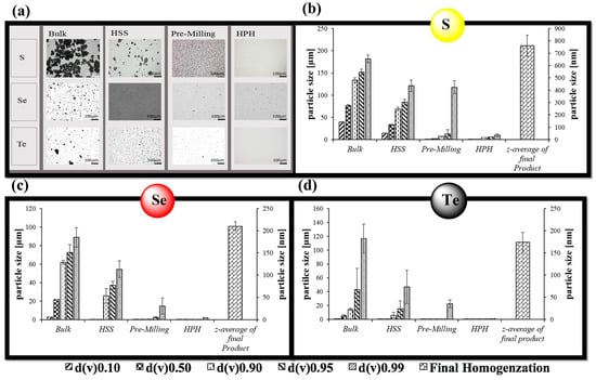 In good agreement with our previous findings, a combination of HSS, pre-milling and HPH resulted in spherical particles of sulfur, selenium and tellurium with diameters in the range of 760 nm for sulfur, 210 nm for selenium and 175 nm for tellurium (Figure 1) [15,25]. Figure 1 confirms that the combination of so-called pre-milling and subsequent cycles of HPH is able to reduce the size of the particles considerably. A lower limit is reached in all cases, implying that the method at hand is able to produce good quality particles with sub-micrometer diameters, yet cannot go much below the 100 nm range.
