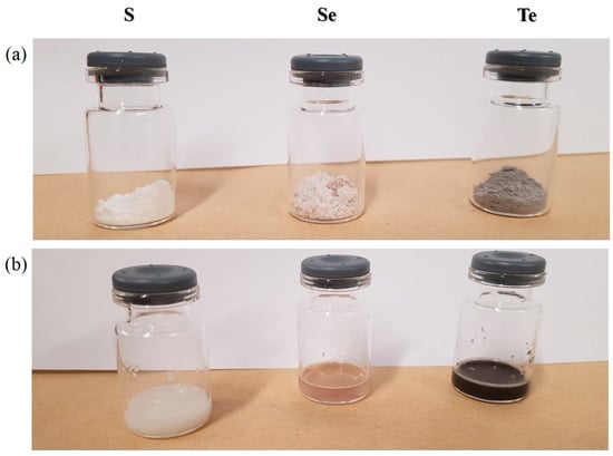 Figure 3 shows photographic images of the lyophilized samples before and after resuspension in distilled water. In essence, the lyophilized samples shown in Figure 3a are powder-like and show the corresponding colors of the respective nanosized materials somewhat eclipsed by the white color of mannitol, i.e., sulfur (pale yellow), selenium (light pinkish red) and tellurium (grey) (Figure 3a). In some aspects, these materials represent “resuspendable” and biologically available forms of the three elements, which apart from the stabilizers Plantacare® (for particle stability) and mannitol (for freeze-drying) consist exclusively of the chalcogen elements. Unlike the elements they are based on, however, these materials can be resuspended readily and easily as shown in Figure 3b.