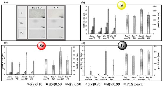 Analysis of the various chalcogen samples. (a) Microscopic view of samples after 30 days of storage, with a comparison of samples stored as suspensions at 4 °C in the dark (non-FD or “non-freeze-dried”) and resuspended lyophilized samples (FD or “freeze-dried”); LD and PCS measurements of resuspended lyophilized samples of (b) sulfur, (c) selenium and (d) tellurium samples after 1 and 30 days of storage. The values obtained compare well with the results for the native samples provided in Figure 1.