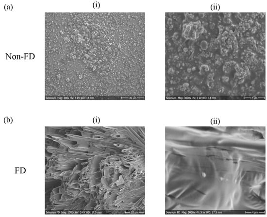 SEM micrographs of selenium particles. (a) micrographs of non-FD samples at (i) 800 and (ii) 3000× magnification; (b) micrographs of FD samples at (i) 1000× and (ii) 5000× magnification.